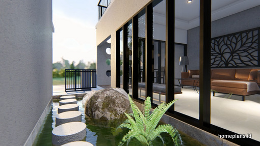 Diharapkan desain ini dapat digunakan oleh keluarga dengan 3 orang anak, karena desain rumah ini dirancang dengan 4 kamar tidur. Terdapat elemen kolam ikan sebagai aspek rekreatif yang memberikan nuansa segar pada seluruh rumah.